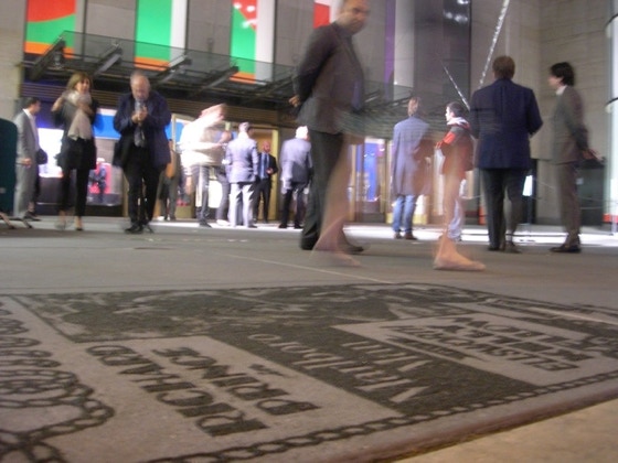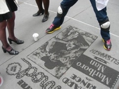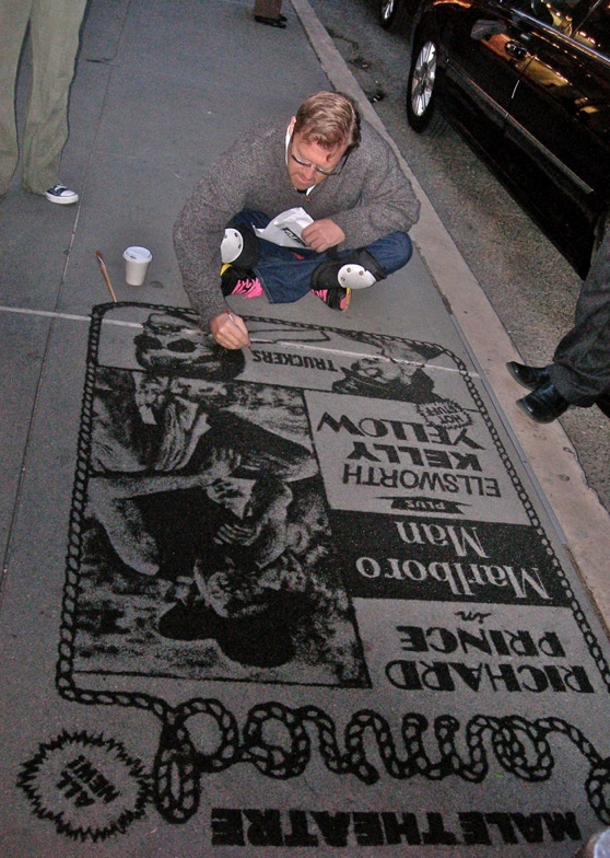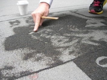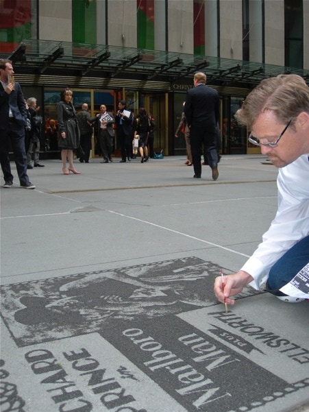 9:00 pm a sweet sweet press photographer fawned over my piece and ushered me inside for the post auction buffet. After 8 hrs non-stop I was hungry and grateful to Christie’s for the repast. When we came out Christies had swept the sidewalk clean. The photographer was shocked. When the public unintentionally erases my sand work it feels like a DuChampian act of chance & nature. The press photographer felt that an antagonistic company’s sweeping up the “work” was vandalism.