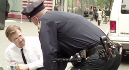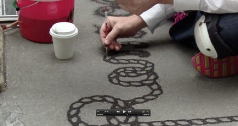 actively blocking my cameraman from capturing Ayala and the NYPD’s behavior. It’s like in South America or Israel where the police put on balaclavas – they have moral and legal anxiety over they’re actions and attempt to conceal their behavior. To my surprise NYPD only questioned me for a few minutes. I assured them the sand was temporary and as Officer Borum looked for an situation in which I’d block traffic I assured him, no, if a passenger steps out of their car and crosses my sand painting I won’t stop them in any way. I noted that no one had ever intentionally stepped on my sand paintings.