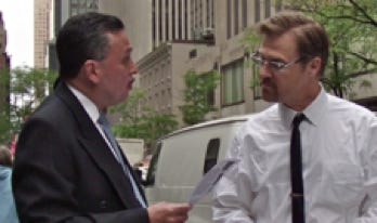 Rockefeller security hit hard, first a young guard, Teague, dashed at me, tapping my arm and ordering me to stop. Then a white-haired authoritative man in full suited regalia commanded, “You can’t do that, this is private property. All of this is owned by Rockefeller Center.” I kept asserting this was a public sidewalk and security kept denying it telling me to go to the Avenues on the other side. The security have this shameless tactic, they stand in front of the videographer, they’re afraid to have their behavior and lies on video – so as Joe Ayala, Protection Supervisor talks his associates form a visual