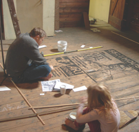 My art portrays imagery from the 70’s and 80’s, the coming of age of my generation and of AIDS. It deals innocently with a forbidden nostalgia. The evocations contributed by the passers by is much of the work and my pursuit of those “speakers” who offer stories of their experiences create links between myself as a “strait” man/artist and invaluable seminal contemporary of homosexuals to culture. Sufi, Tebetan, Mexican Catholics, Hopi, and many religions are direct connections to sand painting. A ephemeral activity generates tremendous cross-cultural interaction, beyond age, language geogrpahy or sexual orientation.
